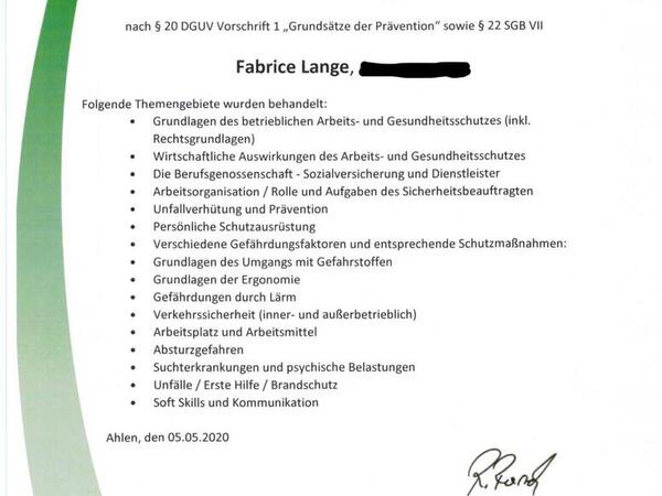Unser Mitarbeiter Fabrice Lange hat erfolgreich seine Weiterbildung zum Sicherheitsbeauftragten absolviert und